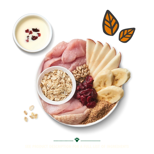 브랙퍼스트 크런치는 닭간, 요거트, 베리, 바나나, 해바라기씨, 귀리와 함께 신선하게